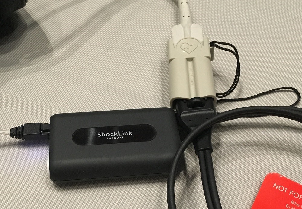 ZOLL전극어댑터를사용하여ZOLL트레이닝패드를제세동기에하고,shocklink를zoll트레이닝패드패드에앞단에있는플러그삽입합니다이미지오른쪽오른쪽과。