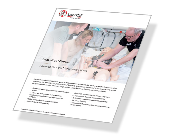 This three-day workshop is taught by skilled Laerdal Field Service Engineers and is designed for experienced Simulation Lab operations staff. Participants will have the opportunity to delve deep into the SimMan 3G* platform’s technical functionality, will have ample hands-on time and leave with a course certificate that allows them to perform Preventive Maintenance Service on their organization’s SimMan 3G platform manikins.