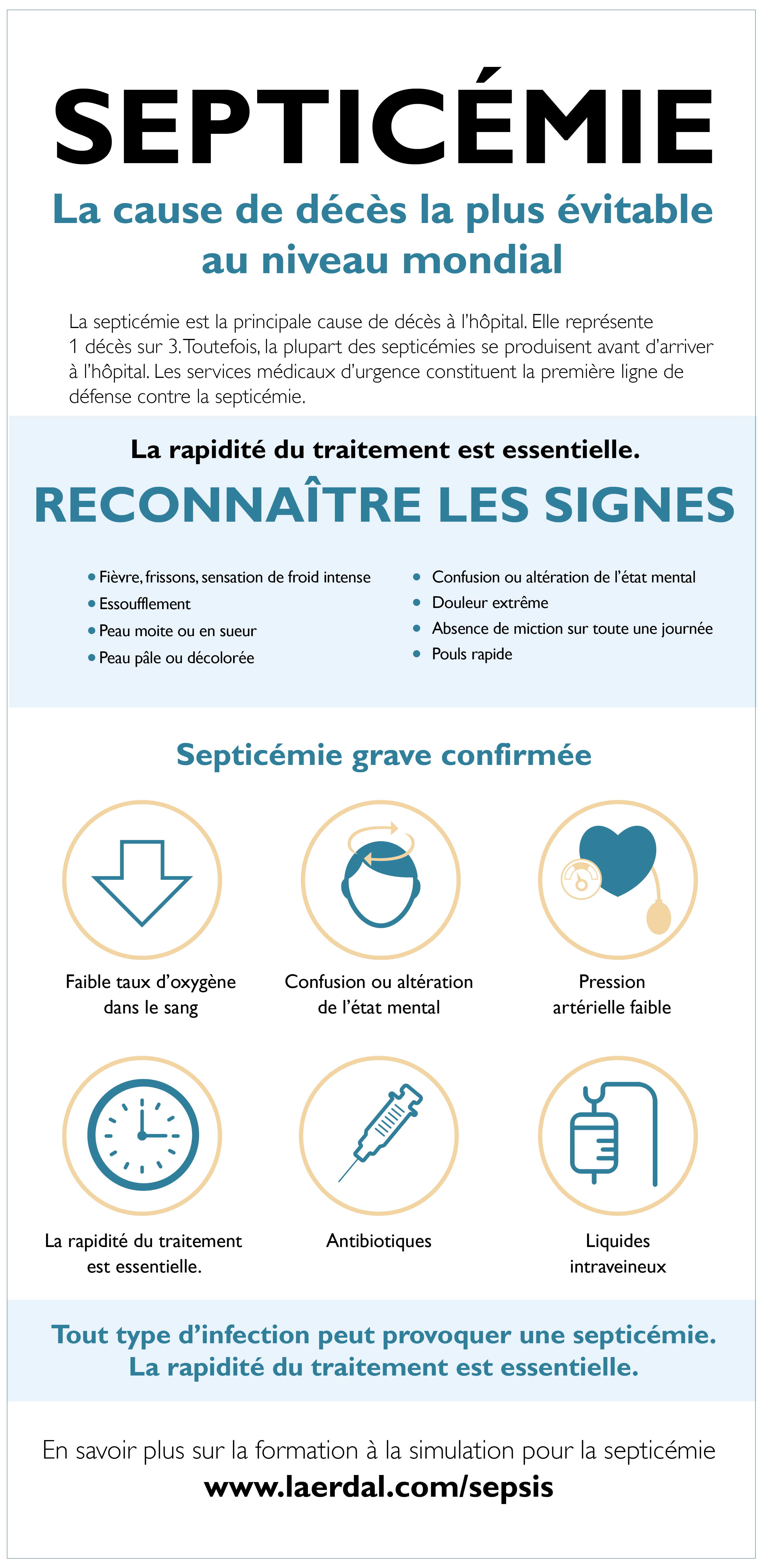 Meme一个感染mineure可以夹带剂的一个9月icémie. La septicémie : une infection courante, mais peu reconnue. Ceci est dû à la confusion au sujet des signes de la septicémie parmi les patients et les professionnels de santé, à une documentation insuffisante sur la septicémie comme cause de décès, à des outils diagnostics inadéquats et à un manque de cohérence dans l’application des directives cliniques standards pour le traitement de la septicémie.
