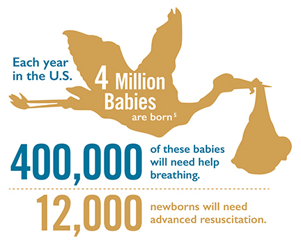 대략 4백만 명의 아기가 매년 미국에서 태어납니다.6이들 가운데 40만 명은 호흡하는데 도움이 필요하며/필요하거나, 양압 환기를 통해 자궁 밖에서의 정상적인 생활이 가능해집니다. 그리고, 12,000명이나 되는 소아들은 가슴 압박 및 심장 관련 약물 요법과 같은 전문적인 소생술을 필요로 합니다.7